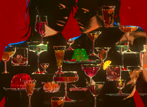 - TIX mixed media style, interesting way of coloring, composition with thin/no lines, no features on face but eyes