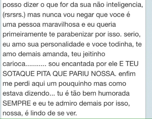 e não é que foi lindo demais? eu olhei pra trás e vi você: tudo que eu imaginava de você, btw, sem nem por nem tirar (achava que era mais alta mas. tudo bem.) você é realmente especial amanda, você tem seu brilho e eu pude ter certeza dele logo que eu te vi e você correu pra me abraçar carregando toda a alegria do mundo. te amo muito muito muito muito e quanto mais eu olhava pra você e a gente ria involuntariamente, mais eu tive certeza disso. ps: achei outras coisinhas também.