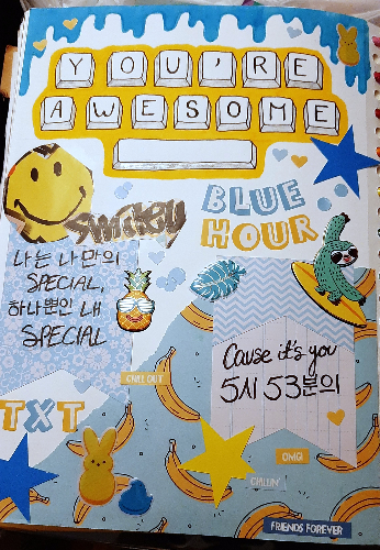 - This Notebook page feels like it's very Maddie to me. I love the keyboard letters, and I got to use a lot of my fun new stickers. The lyrics are from Blue Hour by TXT, and I based some of the aesthetic of the page around the concept photos from that album.