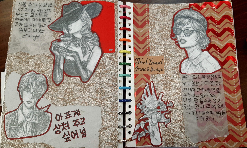 - Sketches I did on Saturday while I was home alone with my cats ^^ I love these ones, and I decided to cut them out and make them into a notebook page. My mom even said the second image might be the best boy I've ever drawn, which made me really happy. This has got to be one of if not my favorite page I've done. The lyrics are from Feel Good by Irene & Seulgi.