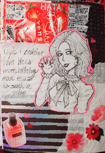 - Another Notebook page~ I did this one the night after the last time I went on a coffee/scrapbook/sushi date with Ray and Maddie. It's mostly inspired by things we did. The label is from the strawberry ramune I got at the restaurant, the quote is a comment Maddie saw online that reminded her of me, and the drawing is because Ray said if any of the three of us was a vampire, it would be me. I loooove drawing with my fineliners, especially doing hatching like this. I think it came out really cute <3