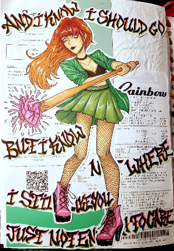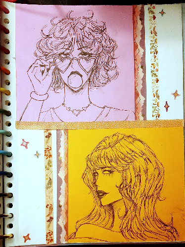 - I've been doing a lot of drawing and collages in The Notebook lately. I've just been feeling so creative and inspired! This one is inspired by the song Sticks and Stones by LØREN. It's been a while since I've done hand lettering, and I've never done graffiti style letters, so this was fun. The other image is some more drawings I did on the opposite page, I was just doodling on some construction paper I had but I think they're cute. I liked doing the kind of swoopy lines for hilights on the hair. And I used some of my new washi tapes to outline them ^^