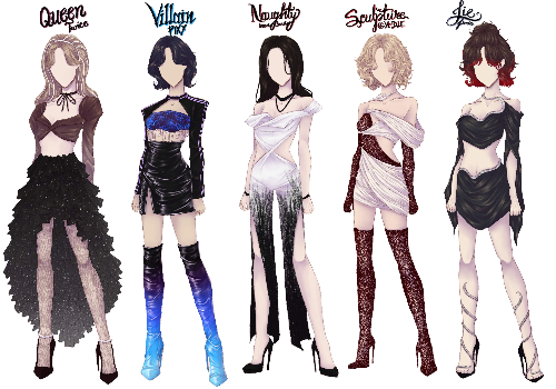 - These are some more outfit designs I've done, this time based on songs. The songs in order are Queen by Twice, Villain by Pixy, Naughty by Irene & Seulgi, Sculpture by (G)I-DLE, and Lie by Jimin.