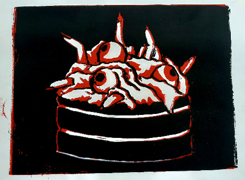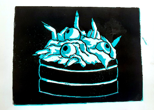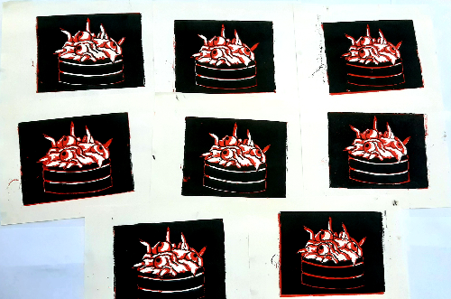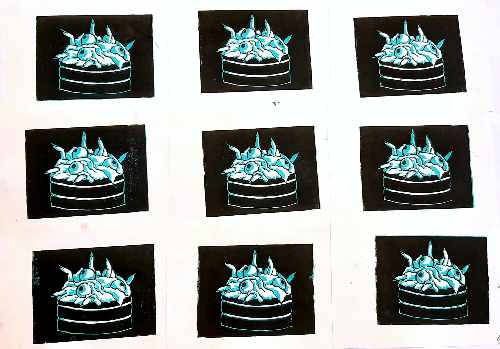- In art class, we were doing linocut printmaking. I knew for my prints I wanted to do some sort of kpop reference, so I chose to make the cake from Stray Kids's Up All Night music video, since its spooky season, and it's one of my favorite songs. These took FOREVER. I mean, that's totally my fault becauase I made a ton of them, but I really wanted to make sure I got a few good ones. I did most of them in cyan, but I did try a few in red just for fun, and I like them.