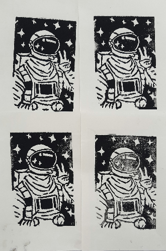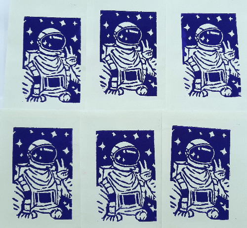 - These are some small single color reduction linocut prints I did for art class. I did an astronaut because its me, I'm an astronaut. I really hate the stuff we carved these in, the linoleum creates wayyy better prints. I think they turned out ok though.