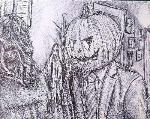 - Another art class assignment, a pen sketch of a scene from real life or a show/movie. I drew the scene from The Office, from the cold open where Dwight put a pumpkin on his head to scare Erin and then got stuck. Also appropriate for spooky season!