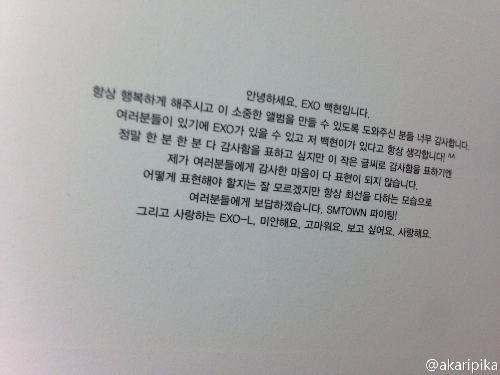 Hello. This is EXO's Baekhyun. I'm very grateful to everyone who happily helped us make this precious album. I always think it's because of everyone that EXO and Baekhyun are able to exist! I want to express my thanks to every single one of you but I can only manage to express my thanks through this small message. I can't express how much I am thankful to all of you. Even though I don't know how to express it, I wish to show my best self to everyone to repay you all. SMTOWN fighting! And to my beloved EXO-L, I'm sorry, thank you, I miss you, I love you. (((BYUN STOP ))