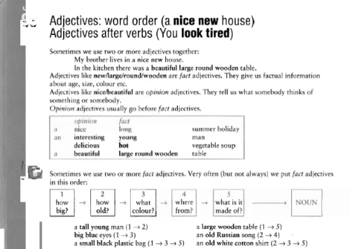 - The Elements of Eloquence: How to Turn the Perfect English Phrase. Adjectives, writes the author, professional stickler Mark Forsyth, “absolutely have to be in this order: opinion-size-age-shape-colour-origin-material-purpose Noun. So you can have a lovely little old rectangular green French silver whittling knife. But if you mess with that order in the slightest you’ll sound like a maniac.”