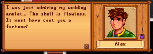 - I actually bought two of these (cause I wanted one)... heh, and wondered what would happen if I gave him another? But he said this and... looked up that others tend to say this as well.. Which was kinda a bummer, like some special dialogue I think should be had if you give it to your spouse? Idk. Oh and in this playthrough, I was married to someone else before Alex.... Then I divorced my other partner... and... yeah... stuff happened so I was able to get two. ^^; I was using a marriage mod at the time. SUPER AWKWARD so that save is gone.
