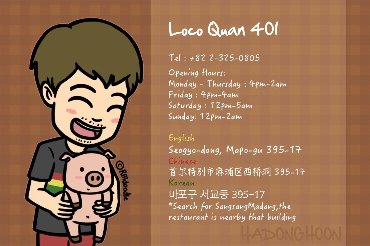 - Seogyo-dong, Mapo-gu 395-17 (Hongdae branch, very near “Sang Sang Madang”) / x x