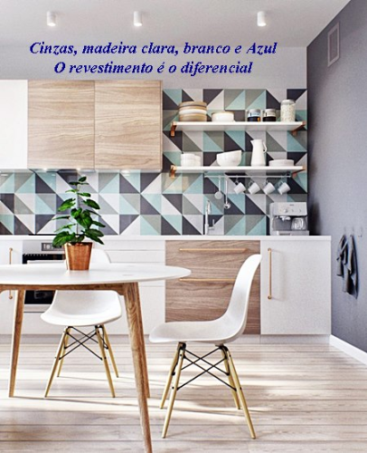 Mesclar branco,cinza,azul e revestimentos em madeira nos armários. Substituir o papel de parede por pastilhas para facilitar a limpeza. Deixar a maior parte dos detalhes em cinza a cargo dos eletrodomésticos em inox e fazer um degradê de pontos em azul entre as pastilhas e os objetos na cozinha.