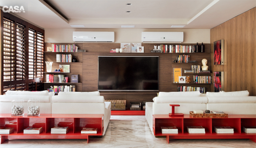 TV centralizada em painel de madeira com estantes. Incluir pequenos nichos na parte de baixo para apoiar receptor da televisão, aparelho blue-ray e guardar caixas com fios, carregadores, controles, manuais de instrução e etc para que não fiquem jogados pela casa.