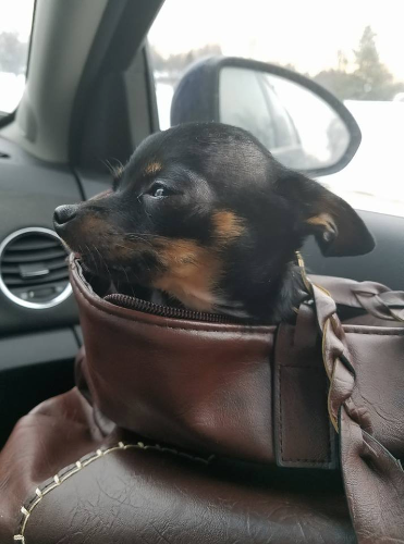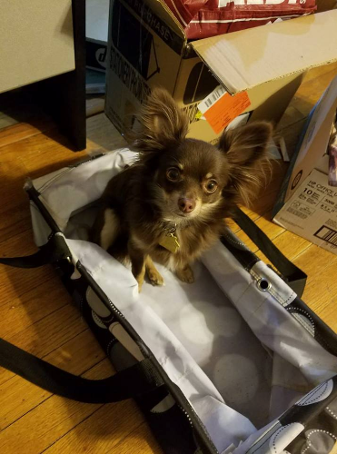 Essie/Espresso ; 1 year old ; March 30th ; Chihuahua ; Black, brown, and white fur ; Dark brown eyes ; Female