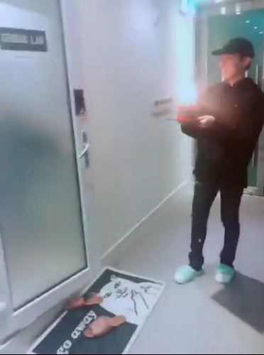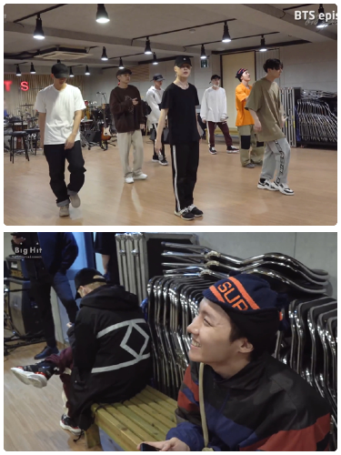 i have confirmed that the one sitting next to hoseok is yoongi. The 190824 Bangtan Bomb is taken at the same time with Bangtan Bomb 190823 (@SNL) when they practice Boy With Luv, Yoongi wore the same pants, shoes, and cap but he took off the coat when practicing. Also other member like Hoseok, JK, and Jimin is wearing the same clothes and the setting is also the same at PTS studio.