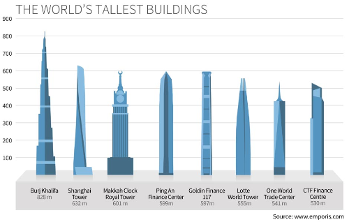 Here are the top 5 building/towers in the world. Clearly this places the Diamond Tower (612 meters) in the top 5! Exciting times ahead!