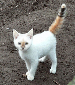 - A striking white kit with a bright, ruddy blaze on his muzzle. Sorrelkit's tail is foxish in appearance with variegation in coppery tones paired with a thick black stripe near the white-tipped end. His thick white lashes highlight the odd blue and green sectoral heterochromia in each of his eyes; both eyes are blue closest to the snout and green closer to the cheeks. Dark, dingy pink flesh covers his nose and paw pads.