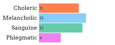 Your temperament is melancholic. The melancholic temperament is fundamentally introverted and thoughtful. Melancholic people often were perceived as very (or overly) pondering and considerate, getting rather worried when they could not be on time for events. Melancholics can be highly creative in activities such as poetry and art - and can become preoccupied with the tragedy and cruelty in the world. Often they are perfectionists. They are self-reliant and independent; one negative part of being a melancholic is that they can get so involved in what they are doing they forget to think of others.