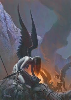 - “Las negras Fatalidades rechinando sus dientes blancos, ojos severos, fieras, sangrientas, aterradoramente se enfrentaron a los hombres agonizantes, pues estaban deseosas de beber su sangre oscura. Tan pronto como agarraban a un hombre que había caído o acababa de ser herido, una de ellas apretaba sus grandes garras en torno a él y su alma bajaba al Hades, al frío Tártaro. Y cuando había satisfecho sus corazones con sangre humana, arrojaban a ése tras ellas y se apresuraban de vuelta a la batalla y el tumulto.”