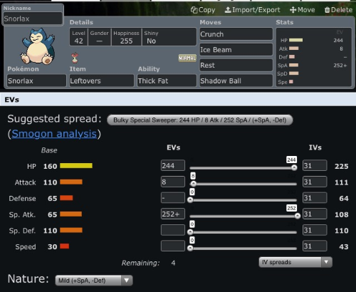 - Moveset: Crunch, Ice Beam, Rest, Shadow Ball