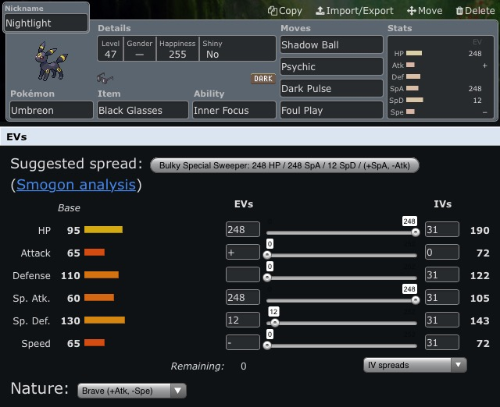 - Moveset: Shadow Ball, Psychic, Dark Pulse, Foul Play