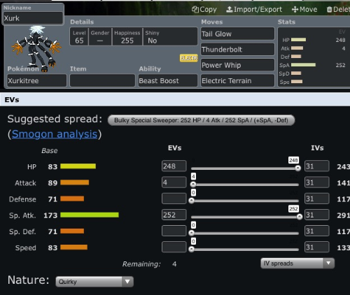 - Moveset: Tail Glow, Thunderbolt, Power Whip, Electric Terrain