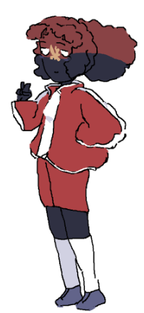 (early on, i actually considered making her a punk because of the punk scene in angola... but i didnt think it would fit very well with my characterization of her, and i wanted the clothing to be interesting BUT simple and easy to draw and remember, so i ended up picking the "jock" jacket and that.)