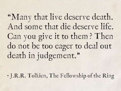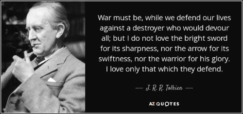“War must be, while we defend our lives against a destroyer who would devour all; but I do not love the bright sword for its sharpness, nor the arrow for its swiftness, nor the warrior for his glory. I love only that which they defend.” (Faramir)