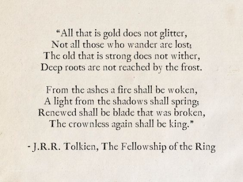 Home is behind / The world ahead. / And there are many paths to tread. / Through shadow, / To the edge of night / Until the stars are all alight / Mist and shadow / Cloud and shade / All shall fade All shall...fade.