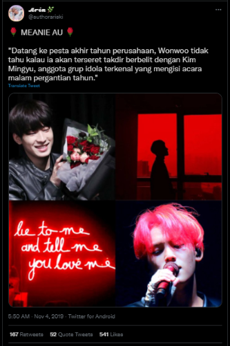 "Datang ke pesta akhir tahun perusahaan, Wonwoo tidak tahu kalau ia akan terseret takdir berbelit dengan Kim Mingyu, anggota grup idola terkenal yang mengisi acara malam pergantian tahun."