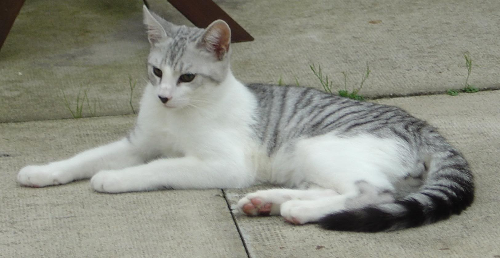 Silver-grey and white tabby she-cat with blue eyes. I was a house cat who was allowed to wander outside. I had a female twin who looked exactly like me but with blue-green eyes. TW:/ ANIMAL DEATH / : I was run over by a large car. My littermate stayed beside me on the road until I breathed my last breath. (However, the shoulders were covered while the underbelly and legs were clear)