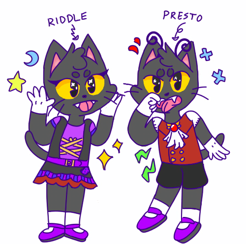 black cat twins, both have bratty little sibling personalities, presto is a bit more sensible and riddle is a bit more rowdy but their personalities mesh together perfectly, always dressed like its halloween