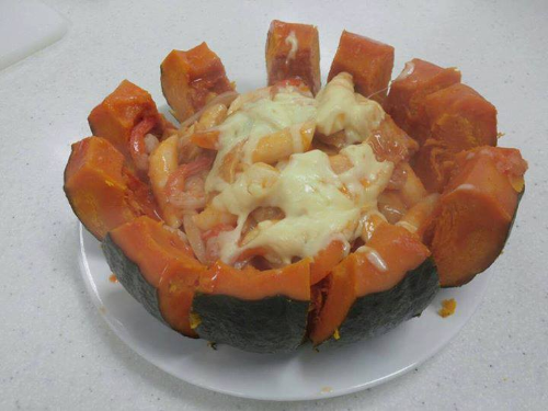 Recipe Cuir de la citrouille à la vapeur. Cuir les bâtonnets de riz (tteokbokki) mettre les bâtonnets à l'intérieur de la citrouille