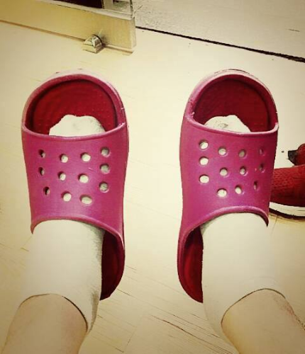 Aujourd’hui, il pleuvait beaucoup, après être rentré chez moi, je portais des shorts et des pantoufles. Je suis fier de mon choix. Si je portais des chaussures, elles seraient probablement bien mouillées. Cependant, quand je suis arrivé ,tout le monde dans la salle d’entraînement a ri. Pourquoi était-ce ainsi………. La couleur est rose……….