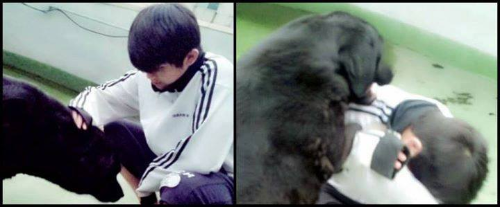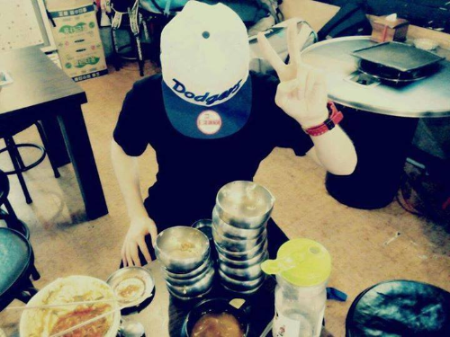 Aujourd’hui, nous avons de nouveau terminé l’entraînement en retard. Nous sommes tous en vacances, donc nous nous sommes réveillés (es-spécialement) plus tard que d’habitude et nous sommes allé à la salle d’entraînement. Mais l’école de Hunie Hyung n’a toujours pas commencé les vacances. Donc à 5h du matin, qui est un moment où l'on s’entrelace plutôt pour dormir ou ne pas dormir, Hunie Hyung a dit qu’il jouerait avec Yeontan dans le grenier, alors je suis allé avec lui. C’est keke (son de rire) aussi mignon que les pingouins, keke (rire) Nous avons nourri Yeontan, probablement parce que Yeontan n’a pas vu Hunie hyung depuis longtemps, il est très heureux et à cause de son excitation, il c’est jeté sur Hunie hyung kekeke (riant) Je ne l’ai pas arrêté, mais j’ai pris des photos d’eux à la place. Je suis un frère si gentil, kekeke (riant)