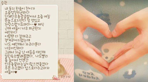 Aujourd’hui, j’ai parlé avec Jihoon hyung. Il est très motivant et touchant. Bien qu’il puisse sembler froid à l'extérieur, ses paroles sont très émouvantes. Tu es génial et le meilleur, Jihoon hyung.♥♥