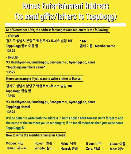 - Q: I want to send ToppDogg/one of the members a gift/letter. Where do I send it to?