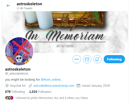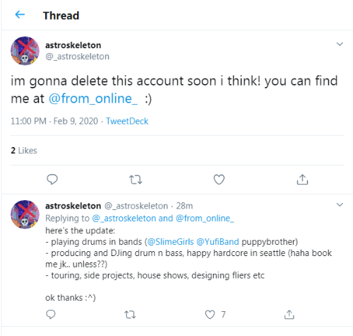 Announcement of deactivation of Twitter account. (https://twitter.com/_astroskeleton/status/1226762897671348224)