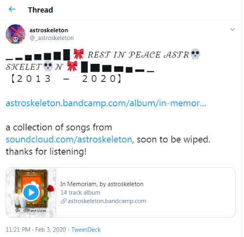 Announcement of "In Memoriam" album. (https://twitter.com/_astroskeleton/status/1224593798379892736)
