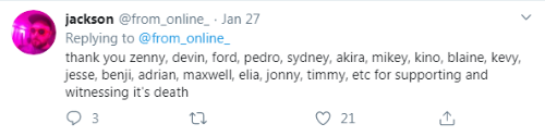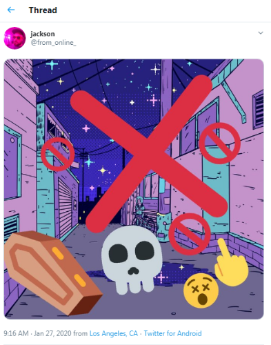 Screenshots taken on February 9, 2020 around 11:30-11:50pm to document when Jackson Scovel's astroskeleton alias was put to rest. Unfortunately, Wayback Machine was not working for tweets/profiles that I could figure out at the moment, so screenshots (and links, if the account is not deactivated) are all I can provide!